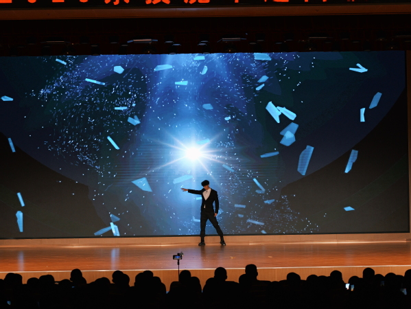 演出渐入尾声,杂技表演《刀锋上的艺术》以口衔刀锋完成惊险平衡,尽显极限控制之美。魔术《炫彩世界》借助大屏呈现虚实交织的视觉幻境,体现了科技与魔术的创新融合。
