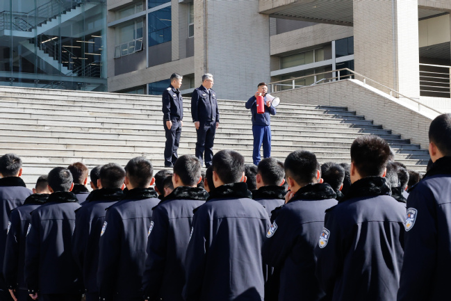 为深入贯彻落实习近平总书记关于加强校园安全工作的重要指示精神,持续强化师生消防安全意识,增强师生应急处置能力,11月26日中午,由学院保卫处牵头,学生工作处、院团委、后勤处协同组织的2025年消防应急疏散演练在学生宿舍杏园开展。总务长、四级职员包学文担任本次演练总指挥,栖霞区消防救援大队吴波参谋对演练进行现场指导,侦查学院1000多名师生参加演练。