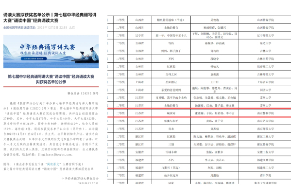 学院团委与语言文字工作委员会办公室高度重视,积极组织学生参赛,并为参赛学子提供专业指导与训练保障。在省级赛事阶段,我院学子表现亮眼,作品《喊黄河》以饱满的情感、磅礴的气势荣获江苏省大学生组特等奖,并成功代表江苏省晋级国赛。历经全国初赛、决赛多轮线上专业评审,最终在众多优秀作品中突围,摘得全国二等奖。