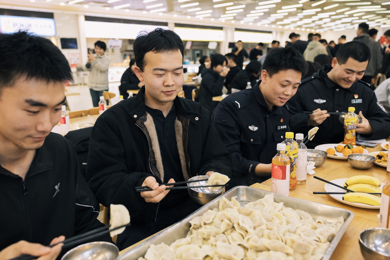 仙林校区学生餐厅内笑语欢声,其乐融融。党委书记肇恒伟、各学生大队相关学管教师深入学生当中,与学警围坐交流,深入了解大家的学习生活和关心关切。各大队学警分工协作,揉面、擀皮、包馅,动作从生疏到娴熟,形态各异的饺子很快摆满餐盘。活动中,师生亲切交流,分享家乡冬至习俗,在劳动协作中深化了同窗情、师生谊。热气腾腾的饺子出锅后,大家品尝着亲手制作的美食,感受着“自己动手、丰衣足食”的满足与传承民俗文化的意义。