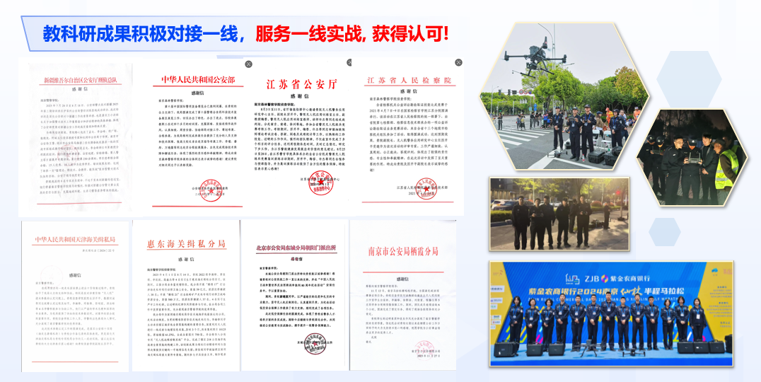 近年来,侦查学院紧密围绕警务实战需求,在人才培养、科研创新与实战转化等方面取得显著成效,逐步构建起具有警校特色的低空警务教学科研体系。学院开设侦查学(无人机微专业),成立无人机社团,积极对接一线实战单位,组织学生参与各类科创项目和学科竞赛,省级以上获奖人数逐年攀升。无人机创新工作室荣获公安部“公安院校人气社团”称号,并荣立公安机关集体三等功。学院先后获批省部级平台5项,包括公安部警用无人机二级培训资质、江苏省高等学校优秀科技创新团队、江苏省产教融合重点基地、江苏省低空技术与工程学院(共建)以及全国森林警务航空运动训练基地,为高水平人才培养提供了坚实载体。团队成员累计承担国家级课题8项(其中国家自然科学基金4项),获授权专利57项(含发明专利9项),多项专利进行成果转化,并在一线推广应用,为行业应用奠定了扎实的理论与技术基础。学院面向全国多地多警种,持续开展警用无人机驾驶执照及低空警务技战法培训,积极构建实战案例库与飞行原理动漫库。相关课程两度入选江苏省一流课程,并出版系列教材,实现了理论教学与实战需求的精准对接。自主研发的无人机安全飞行助手、警用实战模拟训练系统等创新技术已广泛投入一线实战。学院坚持以研促教、教研相长,多次获得实战单位感谢信认可,在服务社会安全与推动警务现代化方面成效卓著。