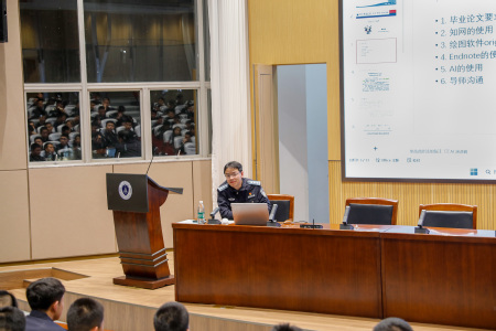 随后,席金忠博士立足本科论文写作的实际需求,从学生视角出发,由浅入深、层层递进地开展了全流程系统指导。他围绕规范查询论文、精准锚定选题、科学搭建框架、规范撰写正文、标准排版格式、高效检索文献、专业制作图表、严格把控查重等关键环节,逐一进行拆解讲授。通过剖析典型实例,席老师系统梳理了引言、正文、结语等部分的写作逻辑,明确了各类型论文字数要求及参考文献著录规范,并重点强调了论文的创新性、严谨性与标准化要求。与此同时,席老师还现场演示了文献管理、数据绘图等实用软件的操作方法,并就合理运用AI工具、提升师生沟通效率等话题与学生展开深入讨论。讲座过程中,同学们认真聆听、细致记录、踊跃提问,现场学习气氛热烈。