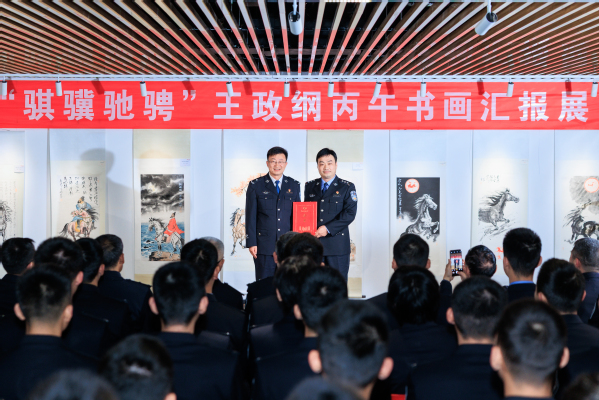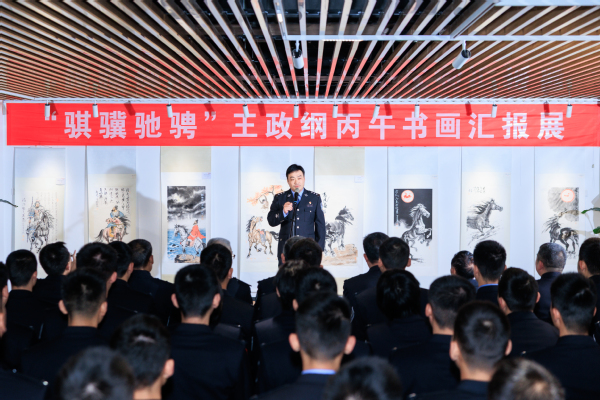 总务长、四级职员包学文致开幕词,他指出,校友王政纲扎根草原情怀,深耕书画艺术,作品以骏马为魂,彰显蒙古马吃苦耐劳、一往无前的品格,与人民警察忠诚担当、勇毅前行的精神高度契合。他勉励全体同学以优秀校友为榜样,坚守梦想,执着追梦,建功警营。